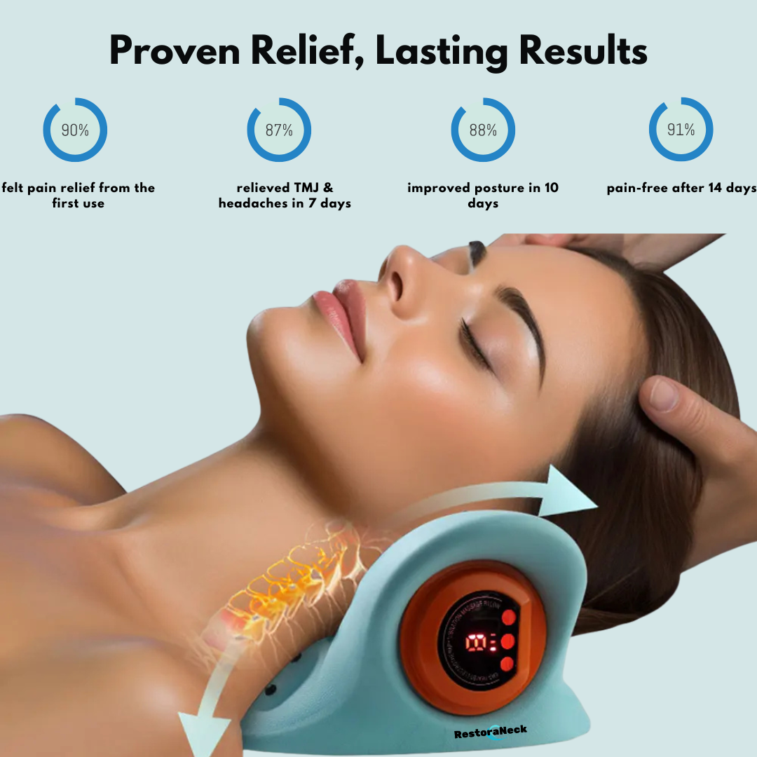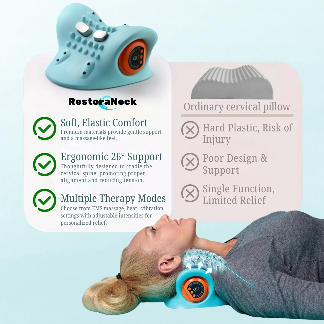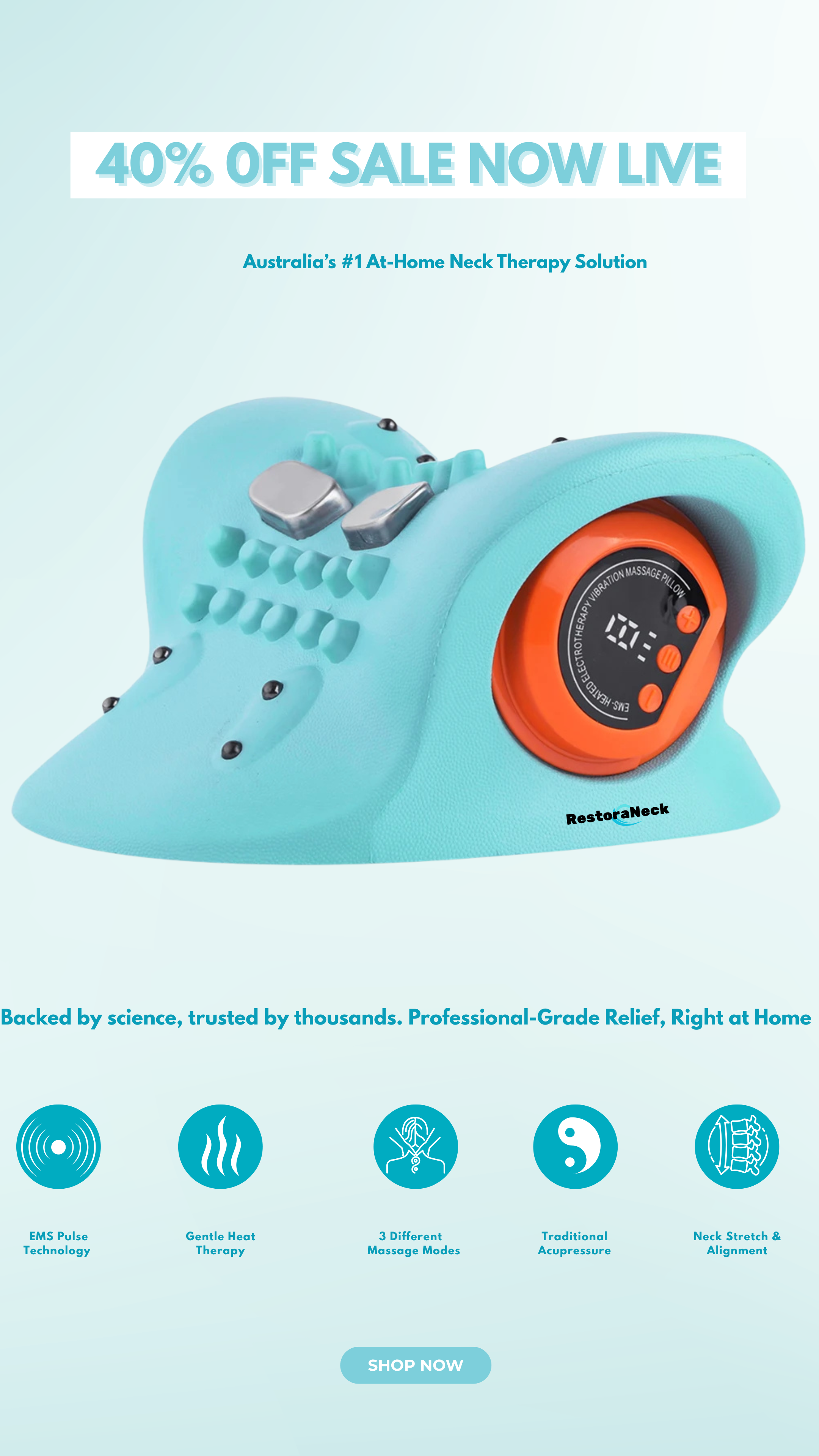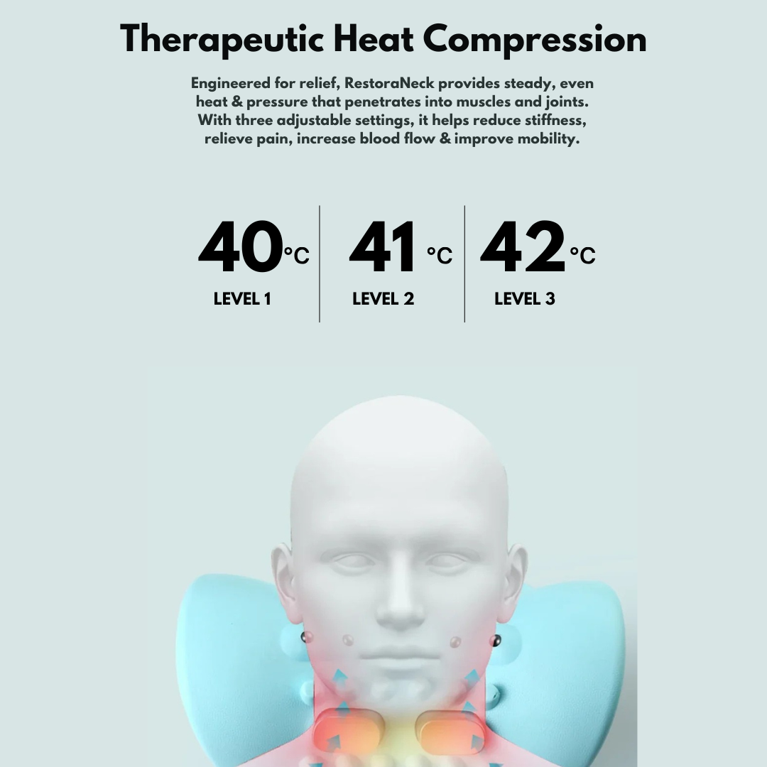 RestoraNeck™ combines EMS pulse technology, gentle stretching, heat therapy, vibration massage, and acupressure — delivering a complete solution for lasting neck comfort.